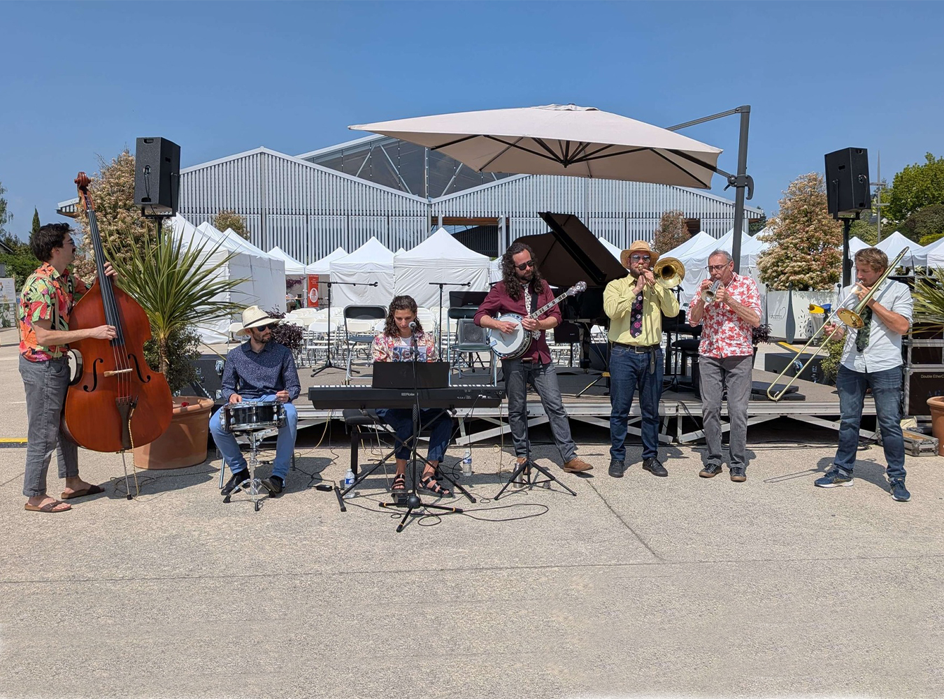 DIMANCHE le collectif revient dans une autre configuration avec TELESCOPIC SWING BAND : un jazz swing New Orleans vibrant, cuivré, rythmé, où le clavier, le banjo, les percussions et les voix dialoguent dans un esprit festif et généreux.